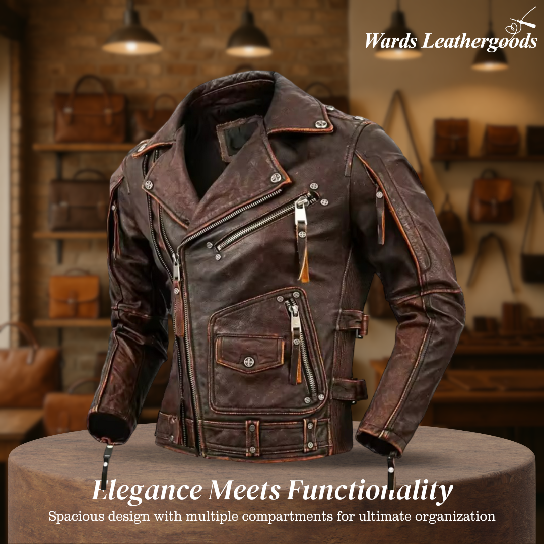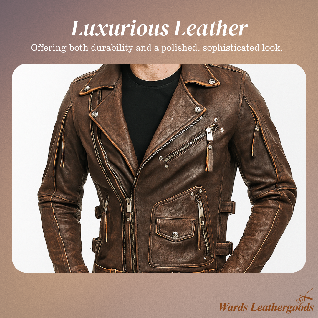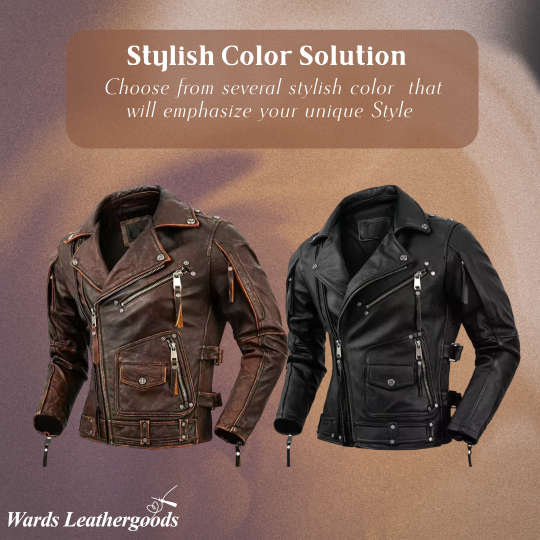 This men’s cowhide leather motorcycle jacket delivers a bold and timeless biker style. Its stone-milled calfskin leather offers a rugged yet refined finish. Perfect for riders and men who want a standout, retro-inspired look.