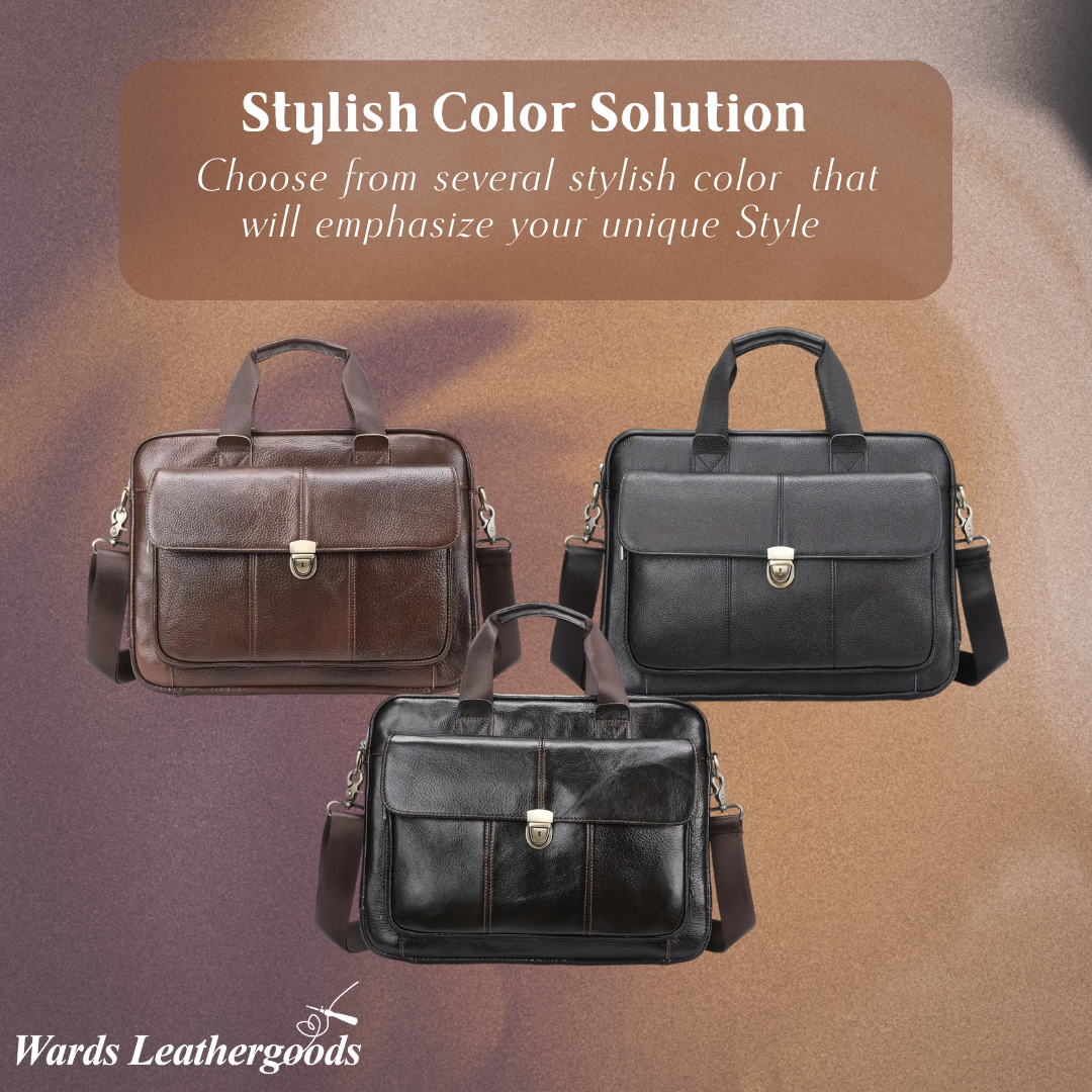 This briefcase bag offers a sleek profile with a secure flap lock. It complements formal attire while carrying documents, a laptop, and daily essentials with ease.