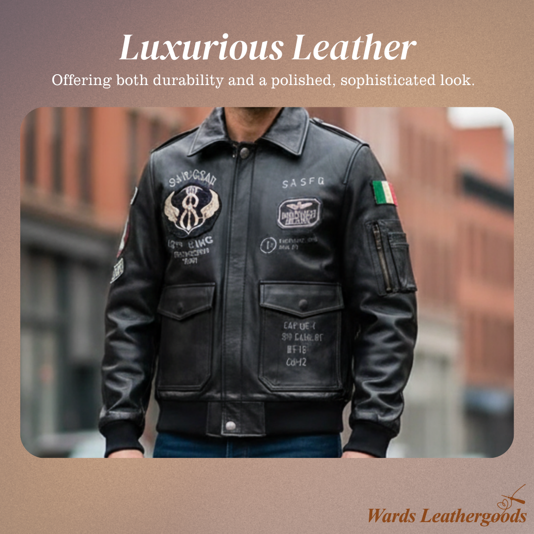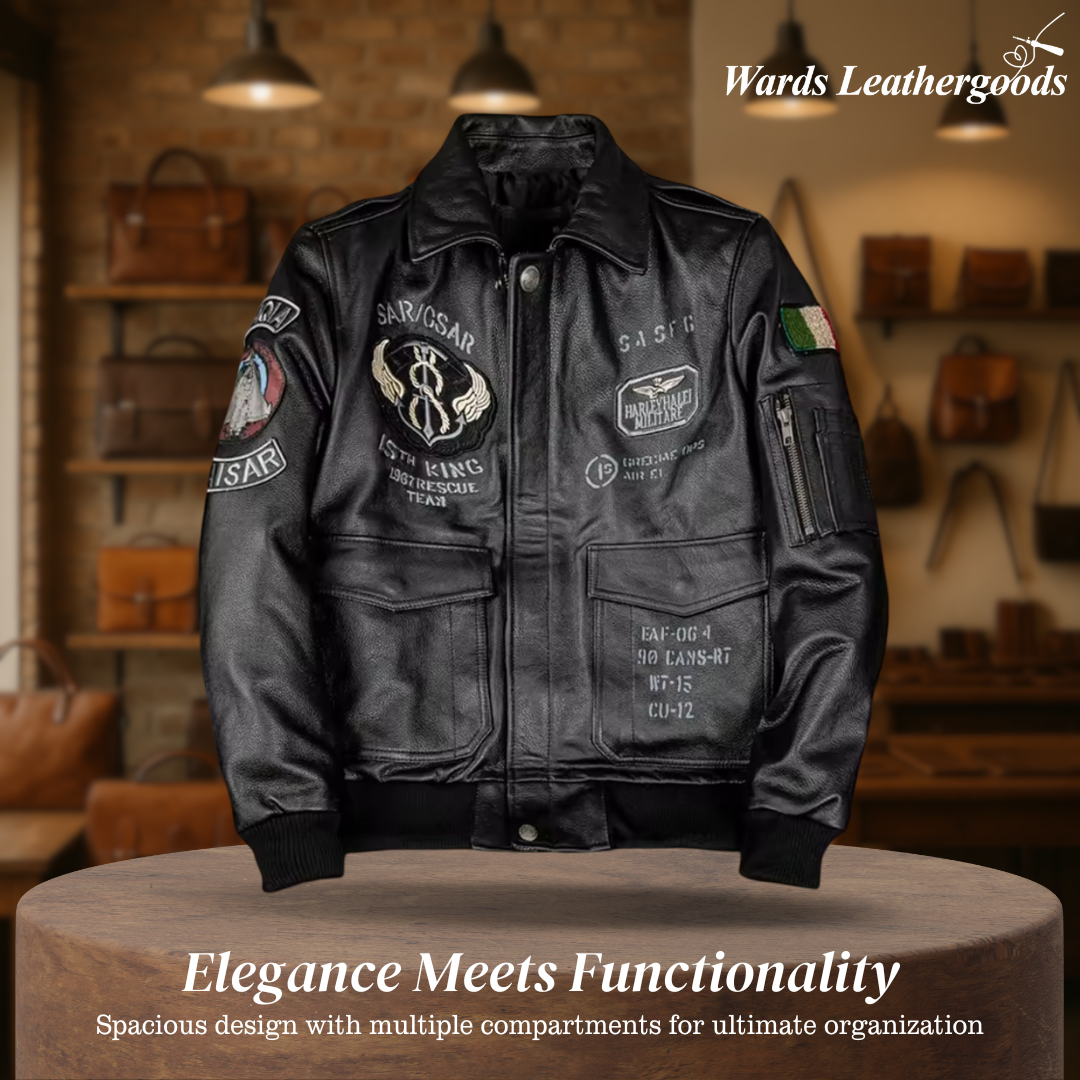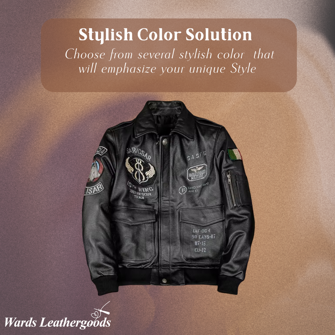 This men’s leather jacket stands out with its embroidered patches and rugged appeal. The detailed accents add character and boldness. Perfect for creating a statement outfit with a vintage edge.